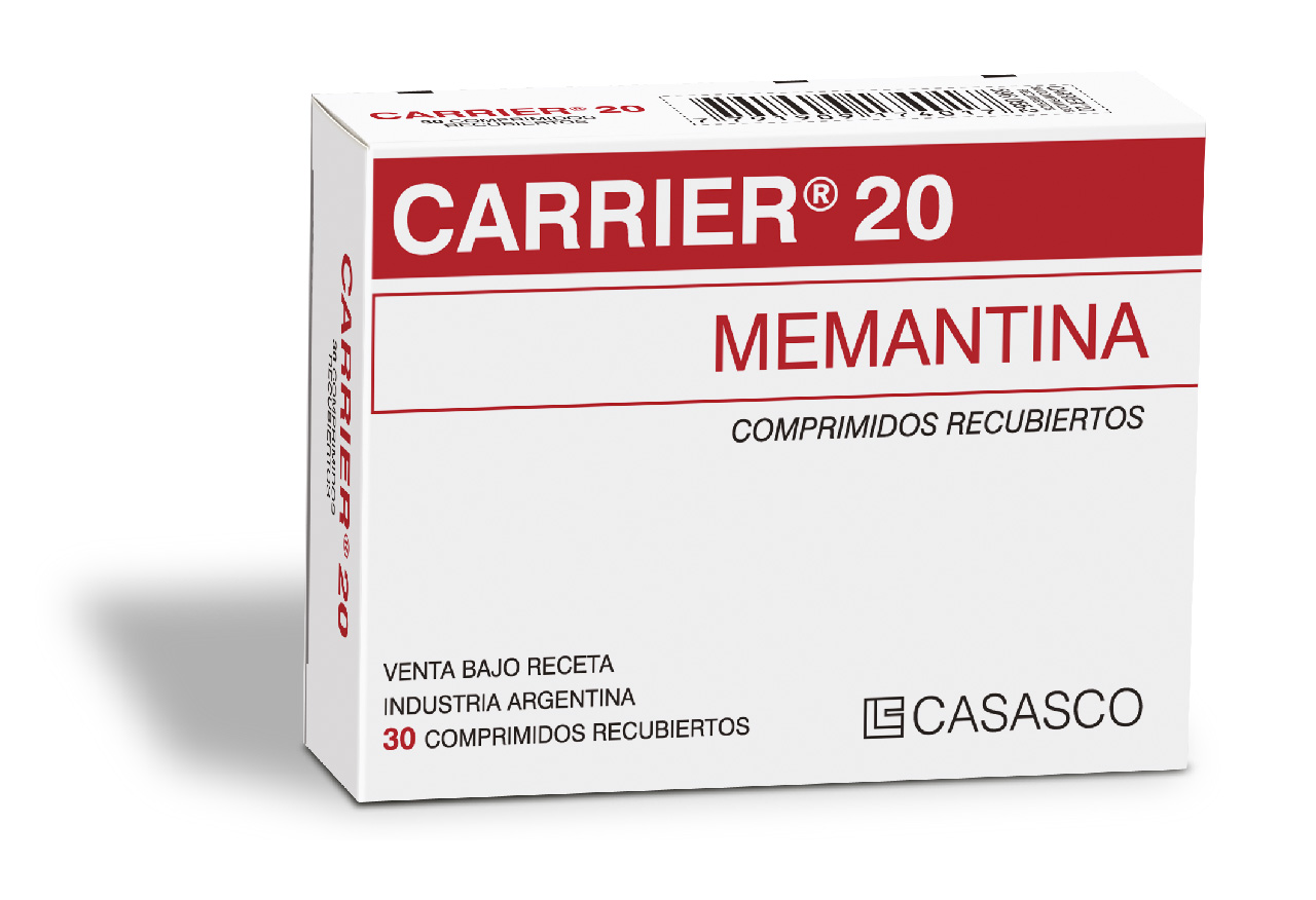 Image removed.     Image removed.Composición Cada comprimido recubierto contiene: Memantina Clorhidrato 20 mg; Exipientes c.s.. Acción Terapéutica Inhibidor no competitivo del receptor NMDA (N-metil-D-aspartato), por lo que disminuye la hiperactividad del glutamato. Indicaciones Tratamiento sintomático de los trastornos cognitivos en pacientes con demencia tipo Alzheimer leve a moderada. Tratamiento de la espasticidad muscular de origen central. Posología Se administra con una posología progresiva, que debe adaptarse a las necesidades, la respuesta terapéutica y la tolerancia de cada paciente en particular, por lo que el tratamiento debe ser iniciado y supervisado por un médico con experiencia en el diagnóstico y tratamiento de Alzheimer. El esquema posológico recomendado es el siguiente: Enfermedad de Alzheimer moderada, moderadamente severa a severa y trastornos neurocognitivos: La dosis diaria es de 20 mg por día. Para reducir el riesgo de efectos adversos esta dosis debe alcanzarse en forma gradual aumentando de a 5 mg durante las primeras 3 semanas de tratamiento de la siguiente manera. Para este aumento gradual se dispone de presentaciones de 5, 10 y 15 mg para las primeras 3 semanas: 1° semana: 1 comprimido de 5 mg una vez por día durante 7 días. 2° semana: 1 comprimido de 10 mg una vez por día durante 7 días. 3° semana: 1 comprimido de 15 mg una vez por día durante 7 días. A partir de la 4° semana: 1 comprimido de 20 mg una vez por día.   CARRIER 20 mg debe administrarse una vez por día, siempre a la misma hora. IMPORTANTE: los comprimidos recubiertos pueden tomarse con o sin alimentos. Insuficiencia renal: en pacientes con función renal levemente afectada (clearance de creatinina de 50-80 ml/min), no es necesario ajustar la dosis. En pacientes con insuficiencia renal moderada (clearance de creatinina de 30-49 ml/min), la dosis diaria debe ser de 10 mg al día. Si se tolera bien después de, al menos 7 días de tratamiento, la dosis podrí aumentarse hasta 20 mg/día de acuerdo con el esquema de titulación estándar. En pacientes con insuficiencia renal grave (clearance de creatinina de 5-29 ml/min), la dosis diaria debe ser de 10 mg/día. Insuficiencia hepática: en pacientes con insuficiencia hepática leve o moderada no es necesario ajustar la dosis. No se dispone de datos del uso de memantina en pacientes con insuficiencia hepática grave. No se recomienda la administración de CARRIER a pacientes con insuficiencia hepática grave. Niños y Adolescentes: No se recomienda el uso de CARRIER  en niños  menores de 18 años debido a la falta de datos de seguridad y eficacia. El tratamiento debe ser iniciado y supervisado por un médico experimentado en el diagnóstico y tratamiento de la demencia tipo Alzheimer. El diagnóstico debe estar basado en criterios diagnósticos aceptados (por ejemplo DSM IV). Se recomienda iniciar la terapia con memantina solo cuando un cuidador o familiar esté disponible para monitorear regularmente la ingesta del fármaco en forma correcta.   Contraindicaciones hipersensibilidad al principio activo o a cualquiera de los componentes de la fórmula, estados confusionales graves, alteración severa de la función renal o hepática, embarazo y lactancia. Presentaciones Envases con 30 comprimidos recubiertos.