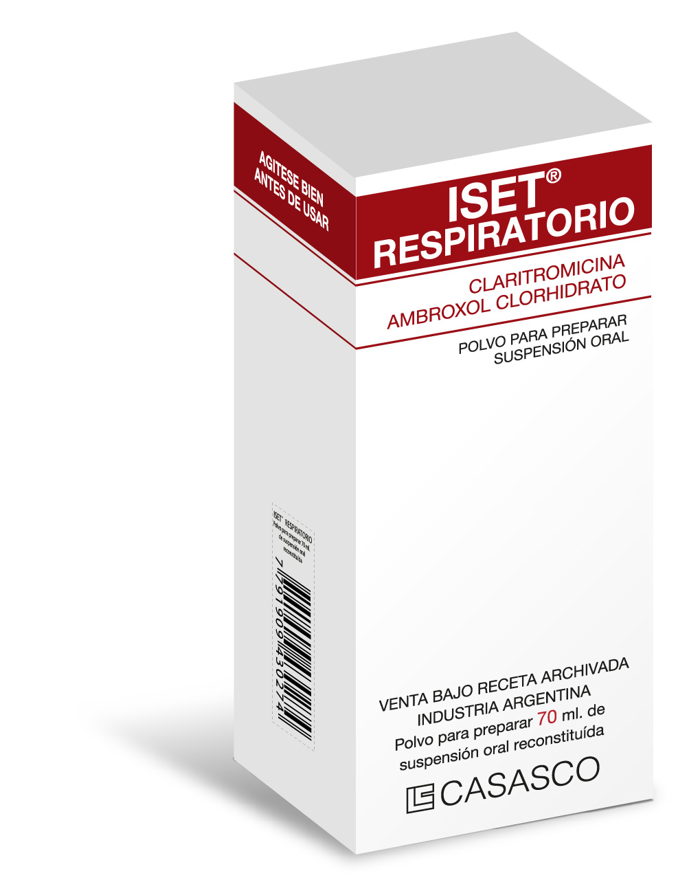 Image removed. Fórmula Cada comprimido recubierto contiene: claritromicina 500 mg; ambroxol clorhidrato 60 mg. Excipientes c.s Cada polvo para preparar suspensión oral contiene: claritromicina 250 mg; ambroxol clorhidrato 15mg. Excipientes c.s Acción Terapéutica Antibiótico, mucolítico y expectorante. Indicaciones ISET RESPIRATORIO está destinado al tratamiento de las infecciones respiratorias ocasionadas por gérmenes sensibles a la claritromicina que cursan con alteración de las secreciones del árbol respiratorio. Posología y Modo de Administración ISET RESPIRATORIO comprimidos recubiertos. Adultos: Infecciones no producidas por micobacterias: la dosis recomendada es de 1 comprimido 2 veces al día. La duración usual del tratamiento es de 7 a 14 días. Infecciones producidas por micobacterias: la dosis inicial recomendada es de 1 comprimido dos veces por día. De no observarse respuesta clínica o bacteriológica en 3 ó 4 semanas la dosis puede ser incrementada a 2 comprimidos 2 veces por día. ISET RESPIRATORIO suspensión oral. Niños: Infecciones no producidas por micobacterias: la dosis recomendada en niños es a razón de 15 mg/kg/día de claritromicina, dividida en dos tomas cada 12 horas, hasta una dosis máxima de 500 mg de claritromicina dos veces al día. La duración del tratamiento es de 5 a 10 días. Contraindicaciones Pacientes con hipersensibilidad conocida a la claritromicina, a otros antibióticos macrólidos, al ambroxol, o a cualquier componente de la formulación. Pacientes en tratamiento con ergotamina, dihidroergotamina, cisaprida y/o pimozida. Precauciones La claritromicina y el ambroxol se metabolizan y excretan principalmente a través del hígado y el riñón. Por lo tanto, administrar con precaución a pacientes con función hepática deteriorada o con disfunción renal moderada a severa. Presentación Comprimidos recubiertos: envases con 16 comprimidos recubiertos. Polvo para preparar suspensión oral: frascos conteniendo polvo para preparar 70 ml de suspensión. Image removed.