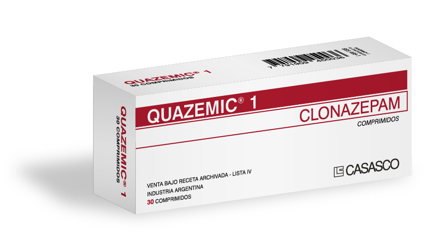 Image removed.   Image removed. Fórmula Cada comprimido de QUAZEMIC contiene: 1 mg de CLONAZEPAM. Excipientes c.s  Acción Terapéutica Ansiolítico. Anticonvulsivante. Indicaciones Trastornos epilépticos: Ausencias (Petit mal) refractarias a succinimidas. Síndrome de Lennox-Gastaut (Petit mal atípico), como monoterapia o como terapia adyuvante. Crisis akinéticas y mioclónicas. Trastorno de angustia (trastorno de pánico) con o sin agorafobia (DSM-IV) Posología y Modo de Administración Trastornos epilépticos: - Niños de hasta 10 años de edad (o hasta 30 kg de peso): Dosis inicial: 0,01-0,03 mg/kg/día sin exceder los 0,05 mg/kg/día, en 2 o 3 tomas. La dosis podrá aumentarse sin exceder los 0,25-0,5 mg cada 3 días, hasta alcanzar una dosis de mantenimiento de 0,1-0,2 mg/kg/día, hasta lograr el control de las crisis, o hasta que la aparición de reacciones adversas impida incrementos posteriores. Cuando sea posible la dosis deberá dividirse en 3 tomas iguales, o bien deberá administrarse la mayor dosis antes de acostarse, a fin de minimizar la somnolencia diurna. - Niños y adolescentes de 10 a 16 años: La dosis inicial es de 1-1,5 mg/día, divididos en 2 o 3 tomas. Esta dosis puede irse aumentando en 0,25-0,5 mg cada 72 horas hasta que se alcance la dosis de mantenimiento individual (por lo general, de 3-6 mg/día). - Adultos: Dosis inicial: se recomienda no superar los 1,5 mg/día, repartidos en 3 tomas. La dosis puede incrementarse de 0,5-1 mg cada 3 días, hasta lograr el control de las crisis o hasta que la aparición de efectos adversos impida incrementos posteriores. La dosis de mantenimiento debe ser determinada individualmente en función de la respuesta clínica y la tolerabilidad de cada paciente. Dosis máxima: 20 mg/día. Trastorno de angustia con o sin agorafobia: - Adultos: Se recomienda una dosis inicial de 0,25 mg, 2 veces por día. La dosis puede ser incrementada a 1 mg/día luego de 3 días. En ensayos clínicos ésta ha resultado ser la dosis óptima en la mayoría de los pacientes; no obstante, en algunos pacientes pueden ser adecuadas dosis de hasta un máximo de 4 mg/día. En tales casos, la dosis puede incrementarse de 0,125 a 0,25 mg (2 veces por día) cada 3 días, hasta lograr el control de los síntomas o hasta la aparición de reacciones adversas que impidan incrementos posteriores. Para reducir la somnolencia, se recomienda la administración de una dosis antes de dormir. El tratamiento no debe exceder el período de 8 a 12 semanas, incluyendo el retiro gradual de la droga. En caso de que el médico considere prolongar su uso, deberá evaluar la relación riesgo/beneficio. Tratamiento concomitante con drogas antiepilépticas (DAE): clonazepam puede administrarse concomitantemente con otros fármacos antiepilépticos. En tal caso, se deberá ajustar la dosis de cada fármaco para lograr el efecto óptimo deseado. Disminución de la dosis o suspensión del tratamiento: la discontinuación del tratamiento con QUAZEMIC debe realizarse progresiva y lentamente. Se sugiere realizar disminuciones de la dosis diaria en no más de 0,125 mg cada 3 días, requiriéndose en algunos casos una reducción aún más lenta. Se debe evitar la discontinuación abrupta del tratamiento por riesgo de síndrome de abstinencia. Poblaciones especiales Neumopatías (como EPOC): se deberá realizar un ajuste de dosis individual en pacientes que presenten neumopatías ya que los efectos respiratorios de clonazepam pueden agravarse por obstrucciones preexistentes de las vías respiratorias. Insuficiencia renal: de acuerdo con los criterios farmacocinéticos, no es necesario un ajuste de dosis en estos pacientes. Sin embargo, se deberá realizar un monitoreo regular de la función renal durante el tratamiento. Insuficiencia hepática: pacientes con alteración hepática de leve a moderada deben ser tratados con la menor dosis posible. Pacientes con alteraciones hepáticas graves no deben ser tratados con Clonazepam, ya que las benzodiazepinas pueden precipitar una encefalopatía hepática. Pacientes de edad avanzada: como otras drogas sedantes, clonazepam puede causar aumento de la sedación y confusión en pacientes de edad avanzada. Por lo tanto, dichos pacientes deberán comenzar el tratamiento con la menor dosis posible, y deberán ser cuidadosamente monitoreados. Los estudios clínicos con clonazepam no incluyen un número suficiente de pacientes mayores de 65 años para determinar si ellos responden de manera diferente al tratamiento. Población pediátrica: no hay evidencia clínica con clonazepam en trastornos de angustia en menores de 18 años. Modo de administración: - Comprimidos birranurados: los comprimidos deben ingerirse con suficiente cantidad de agua. Contraindicaciones Hipersensibilidad conocida a clonazepam, a otras benzodiazepinas, o a cualquiera de los componentes del producto. Pacientes con glaucoma de ángulo estrecho, pudiendo administrarse en pacientes con glaucoma de ángulo abierto adecuadamente tratados. Pacientes con dependencia alcohólica, drogadependencia o farmacodependencia. Insuficiencia respiratoria severa. Pacientes con evidencia bioquímica o clínica de enfermedad hepática severa. Pacientes en coma. Miastenia gravis.   Reacciones adversas - Trastornos epilépticos: las reacciones adversas más frecuentemente observadas se asocian con depresión del SNC. La experiencia con el tratamiento de convulsiones ha mostrado que el 50% de los pacientes presenta somnolencia y el 30% ataxia. En aproximadamente el 25% de los casos se han presentado problemas de comportamiento, pero estos síntomas fueron disminuyendo con el tiempo. Con menor frecuencia se han reportado las siguientes reacciones adversas: Psiquiátricas: depresión, trastornos de la memoria, insomnio, confusión, alucinaciones, histeria, aumento de la libido, psicosis (con mayor probabilidad en pacientes con historia de trastornos psiquiátricos). Reacciones paradojales: excita