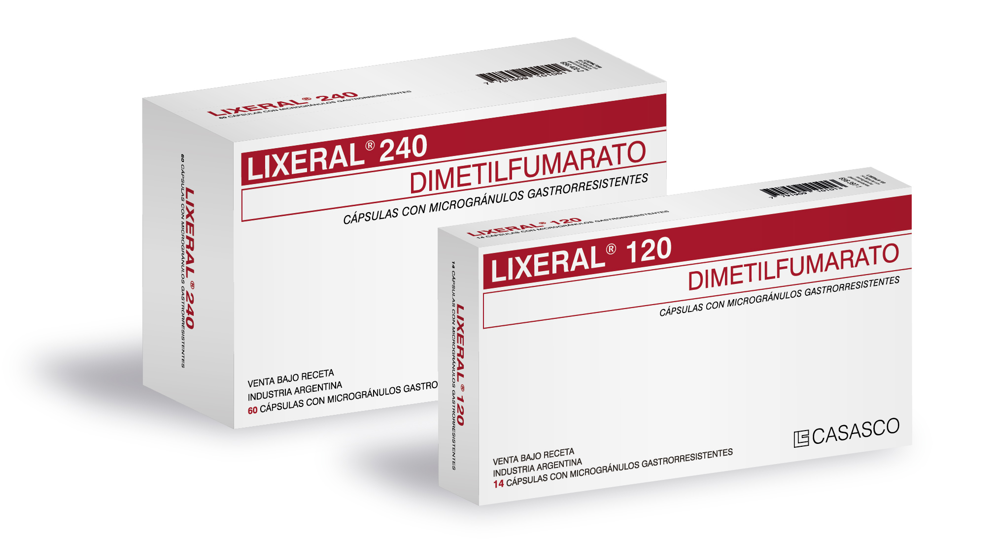 Image removed.   Image removed. Fórmulas LIXERAL 120: Cada cápsula con microgranulos gastrorresistentes contiene: Dimetilfumarato 120 mg; Excipientes: c.s LIXERAL 240: Cada cápsula con microgranulos gastrorresistentes contiene: Dimetilfumarato 240 mg; Excipientes: c.s Acción Terapéutica Inmunomodulador-antiinflamatorio. Indicaciones LIXERAL está indicado para el tratamiento de pacientes adultos con Esclerosis Múltiple con recaídas y remisiones. Posología y Modo de Administración La dosis inicial es de 120 mg dos veces al día. Después de 7 días, se incrementa a la dosis recomendada de 240 mg dos veces al día (ver Prospecto completo) Contraindicaciones Hipersensibilidad conocida al dimetilfumarato o a alguno de los excipientes del producto. Advertencias y Precauciones LIXERAL puede provocar anafilaxia y angioedema luego de la primera dosis o en cualquier momento durante el tratamiento. Los pacientes tratados con LIXERAL pueden desarrollar linfopenia prolongada grave. Se han identificado casos de leucoencefalopatía multifocal progresiva (LMP) (ver Prospecto completo). La seguridad y efectividad de LIXERAL en pacientes pediátricos no ha sido establecida. (ver Prospecto completo) Esta especialidad medicinal está libre de gluten. Presentación LIXERAL 120: envase con 14 cápsulas con microgranulos gastrorresistentes LIXERAL 240: envase con 60 cápsulas microgranulos gastrorresistentes