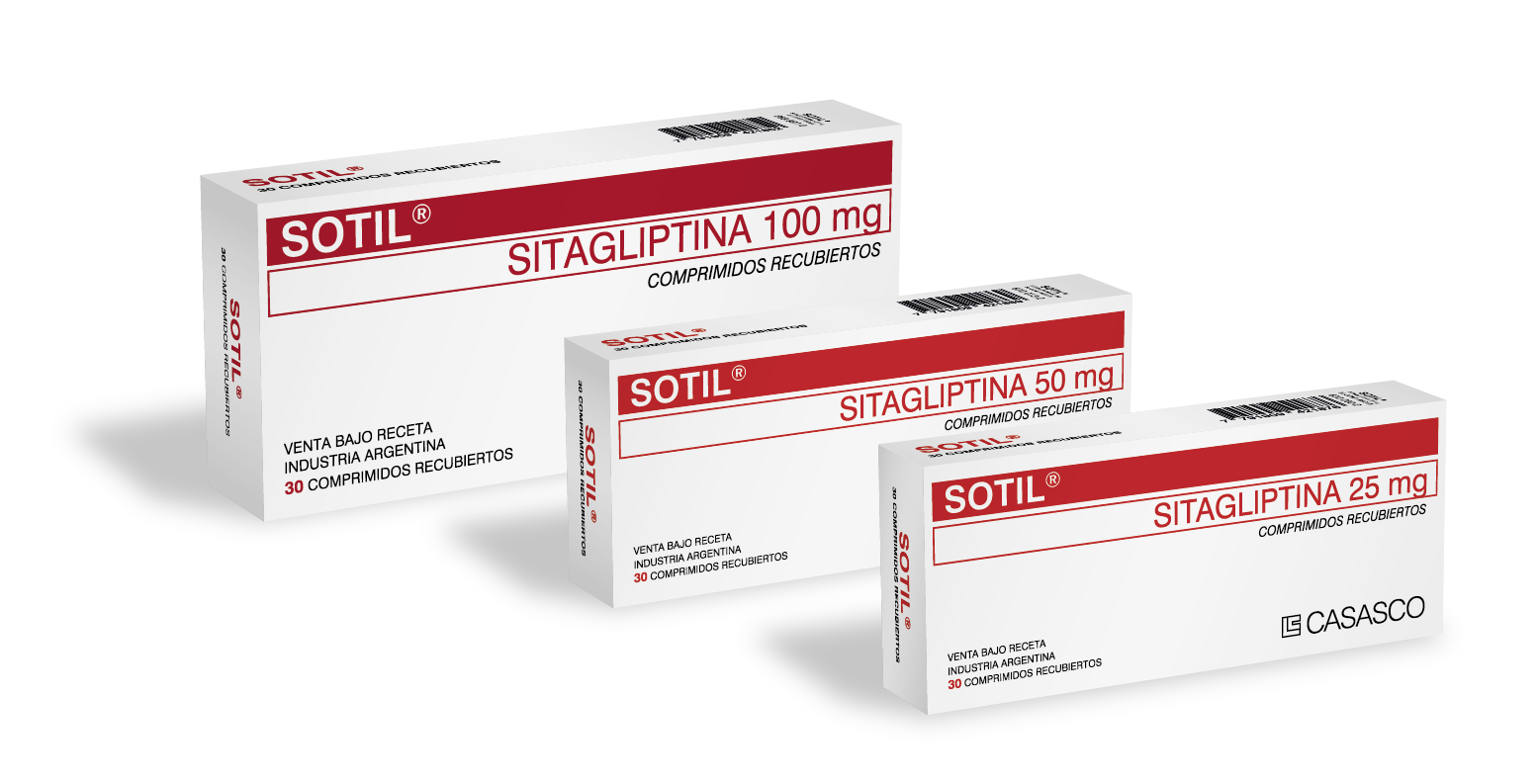 Image removed.     Image removed. Fórmulas Cada comprimido recubierto contiene: sitagliptina, 25 mg. Excipientes c.s. Cada comprimido recubierto contiene: sitagliptina, 50 mg. Excipientes c.s. Cada comprimido recubierto contiene: sitagliptina, 100 mg. Excipientes c.s. Acción Terapéutica Hipoglucemiante.  Indicaciones SOTIL está indicado para mejorar el control glucémico en pacientes adultos con diabetes mellitus tipo 2 como monoterapia, o como terapia oral doble en combinación con metformina o una sulfonilurea, o un agonista PPARγ (tiazolidindionas) o como terapia oral triple en combinación con sulfonilurea y metformina o un agonista PPARγ y metformina. Posología y Modo de Administración La dosis es de 100 mg de sitagliptina una vez por día. Cuando SOTIL se usa en combinación con una sulfonilurea o con insulina, puede darse una dosis más baja de sulfonilurea o insulina para reducir el riesgo de hipoglucemia. Para pacientes con deterioro renal moderado (TFG ≥ 30 a < 45 ml/min), la dosis de SOTIL es 50 mg una vez por día. Para pacientes con deterioro renal grave (TFG ≥ 15 a < 30 ml/min) o con enfermedad renal terminal (ERT) (TFG < 15 ml/min), dosis es de 25 mg una vez por día. Contraindicaciones SOTIL está contraindicado en pacientes hipersensibles al principio activo o a cualquiera de los excipientes del producto. Esta especialidad medicinal está libre de gluten.   Presentación Envases con 30 comprimidos recubiertos.                            .
