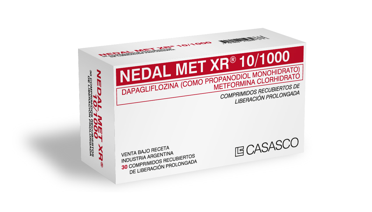 Image removed.   Image removed. Image removed. Fórmulas NEDAL MET XR 5 / 1000 Cada comprimido recubierto contiene:  Dapagliflozina (como Propanodiol monohidrato) 5 mg; Metformina HCl 1000 mg. Exc.  c.s. NEDAL MET XR 10 / 1000 Cada comprimido recubierto contiene:  Dapagliflozina (como Propanodiol monohidrato) 10 mg; Metformina HCl 1000 mg. Exc.  c.s. Acción Terapéutica Combinación de fármacos hipoglucemiantes orales. NEDAL MET XR contiene dapagliflozina, un inhibidor del cotransportador de sodio-glucosa 2, y metformina, una biguanida; NEDAL MET XR está indicada como complemento de la dieta y el ejercicio para mejorar el control glucémico en adultos con diabetes mellitus tipo 2. Indicaciones Complemento de la dieta y el ejercicio para mejorar el control glucémico en adultos con diabetes tipo 2. La dapagliflozina está indicada para reducir: • el riesgo de hospitalización por insuficiencia cardíaca (IC) en adultos con diabetes mellitus tipo 2 y enfermedad cardiovascular establecida o múltiples factores de riesgo cardiovascular. • el riesgo de muerte cardiovascular y hospitalización por IC en adultos con IC con fracción de eyección reducida. • el riesgo de disminución sostenida de tasa de filtración glomerular estimada, enfermedad renal en etapa terminal, muerte cardiovascular y hospitalización por IC en adultos con enfermedad renal crónica en riesgo de progresión. El uso de NEDAL MET XR está limitado a adultos con diabetes mellitus tipo 2 para todas las indicaciones. Posología y Modo de Administración Un comprimido por vía oral una vez al día por la mañana con alimentos; deben tomarse sin triturar, cortar ni masticar. La dosis inicial de dapagliflozina es de 5 mg una vez al día. • Para IC y enfermedad renal crónica, la dosis de dapagliflozina es de 10 mg una vez al día. • Dosis diaria máxima de 10 mg de dapagliflozina y 2000 mg de metformina (HCl). Contraindicaciones Insuficiencia renal moderada a severa, enfermedad renal terminal o pacientes en diálisis.  Hipersensibilidad grave a dapagliflozina o hipersensibilidad a metformina. Acidosis metabólica aguda o crónica, incluyendo cetoacidosis diabética, con o sin coma. Diabetes mellitus tipo 1.   Esta especialidad medicinal está libre de gluten. Presentación NEDAL MET XR 5 / 1000: envases con 60 comprimidos recubiertos de liberación prolongada. NEDAL MET XR 10 / 1000: envases con 30 comprimidos recubiertos de liberación prolongada.