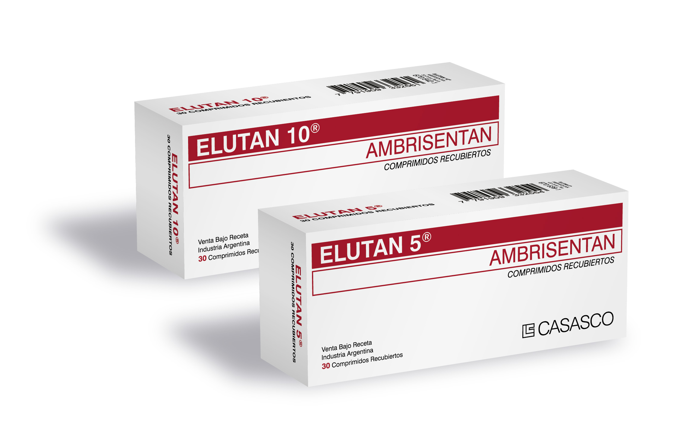 Image removed.   Image removed. Fórmulas Cada comprimido contiene: Ambrisentan 5,00 mg; Excipientes c.s. Cada comprimido contiene: Ambrisentan 10,00 mg; Excipientes c.s. Acción Terapéutica Otros Antihipertensivos. Indicaciones ELUTAN® Ambrisentan está indicado para el tratamiento de pacientes adultos con Hipertensión Arterial Pulmonar (HAP) clasificados como clase funcional II y III de la Organización Mundial de la Salud (OMS), incluyendo el uso en tratamiento en combinación. Se ha demostrado la eficacia de este medicamento en HAP idiopática (HAPI) y en HAP asociada a enfermedad del tejido conectivo. Posología y Modo de Administración El tratamiento debe ser iniciado por un médico experimentado en el tratamiento de HAP. ELUTAN® Ambrisentan en monoterapia ELUTAN® Ambrisentan se debe tomar por vía oral comenzando con una dosis de 5 mg una vez al día que se podrá aumentar a 10 mg diarios, dependiendo de la respuesta clínica y la tolerabilidad.   ELUTAN® Ambrisentan en combinación con Tadalafilo Cuando se utiliza en combinación con tadalafilo, la dosis de ELUTAN® Ambrisentan se debe ajustar hasta alcanzar una dosis de 10 mg una vez al día. Cuando se utiliza en combinación con tadalafilo, comenzar con 5 mg de Ambrisentan y 20 mg de tadalafilo. Dependiendo de la tolerabilidad, la dosis de tadalafilo se aumentó a 40 mg después de 4 semanas y la dosis de Ambrisentan se aumenta a 10 mg después de 8 semanas. Los escasos datos disponibles sugieren que la interrupción brusca del tratamiento con Ambrisentan no está asociada con un empeoramiento rebote de la HAP. Cuando se coadministra con ciclosporina A, la dosis de ELUTAN® Ambrisentan debe ser limitada a 5 mg una vez al día y el paciente debe ser cuidadosamente monitoreado. Pacientes de edad avanzada No es necesario realizar ajuste de la dosis en pacientes mayores de 65 años. Pacientes con insuficiencia renal No es necesario realizar ajuste de la dosis en pacientes con insuficiencia renal. Existe experiencia limitada con Ambrisentan en individuos con insuficiencia renal grave (clearance de creatinina < 30 ml/min); se debe iniciar el tratamiento con cautela en este subgrupo, y prestar especial cuidado si la dosis se incrementa hasta los 10 mg de Ambrisentan. Pacientes con insuficiencia hepática No se debe iniciar el tratamiento con ELUTAN® Ambrisentan en pacientes con insuficiencia hepática grave, ni en aquellos con elevación de los valores de aminotransferasas hepáticas clínicamente significativa (3 x LSN)). Población pediátrica ELUTAN® Ambrisentan no está indicado para el tratamiento de HAP en niños y adolescentes menores de 18 años. Modo de administración Los comprimidos pueden tomarse con o sin alimentos y se recomienda tragarlos enteros. Se recomienda no partir, machacar, ni masticar el comprimido. Contraindicaciones Hipersensibilidad al principio activo o a alguno de los excipientes. Embarazo Mujeres en edad fértil que no utilicen un método anticonceptivo fiable Lactancia materna Insuficiencia hepática grave (con o sin cirrosis) Valores basales de AST y ALT > 3 x LSN Fibrosis pulmonar idiopática (FPI), con o sin hipertensión pulmonar secundaria Esta especialidad medicinal está libre de gluten.   Presentación Envases con 30 comprimidos recubiertos.