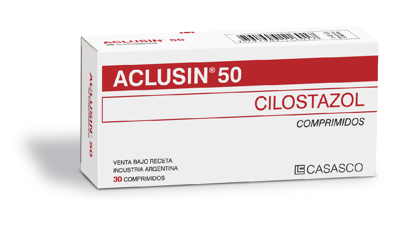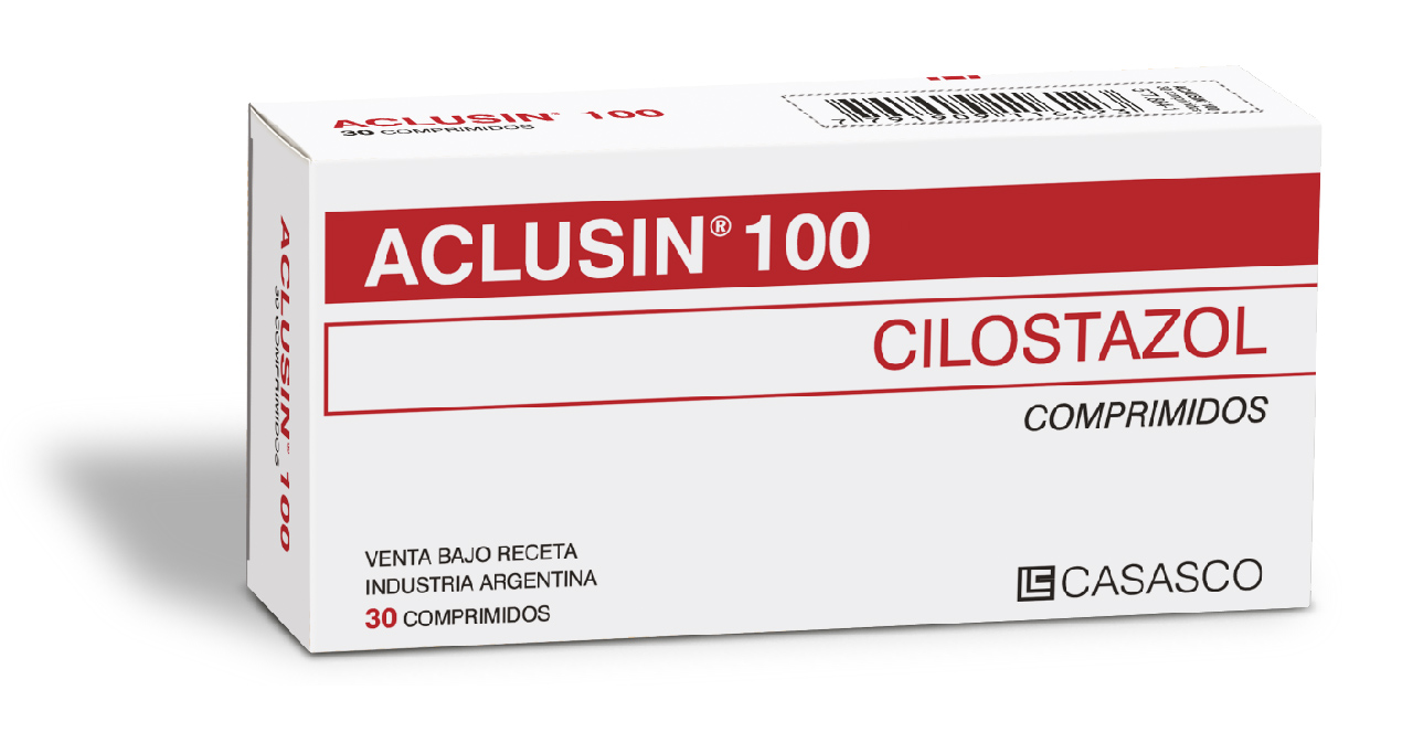 Image removed.     Image removed.Image removed. Composición   Aclusin 50: Cada comprimido de 50mg contiene Cilostazol 50 mg; Excipientes c.s.; Aclusin 100: Cada comprimido de 100mg contiene Cilostazol 100 mg; Excipientes c.s. Acción Terapéutica Vasodilatador periférico y antiagregante plaquetario. Indicaciones Tratamiento de los síntomas isquémicos de los miembros (úlceras, dolor, claudicación intermitente, sensación de frío) debidos a enfermedad arterial oclusiva crónica. Posología Aclusin debe suministrarse con el estómago vacío, 1 hora antes o 2 horas después de las comidas. Dosis habitual: 100 mg cada 12 horas. En pacientes con insuficiencia renal severa (clearance de creatinina < a 25 ml/min.) o en pacientes con administración de inhibidores del CYP 3A4 (fluoxetina, diltiazem, eritromicina) o CYP 2C19 (omeprazol) iniciar el tratamiento con 50 mg cada 12 horas. Contraindicaciones hipersensibilidad al cilostazol o a alguno de los componentes de la formulación. Cuadros hemorrágicos. Pacientes con hemofilia, hemorragia digestiva, hemoptisis, hemorragia vítrea y otros sangrados mayores. Insuficiencia cardíaca. Embarazo o posibilidad de embarazo. Lactancia. Presentaciones  Envase de 50 mg con 30 comprimidos y 100 mg con 30 y 60 comprimidos.