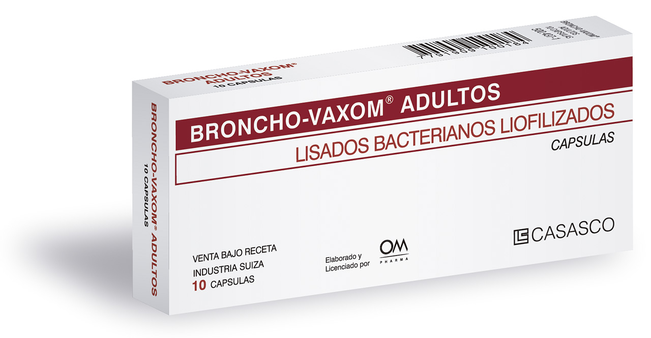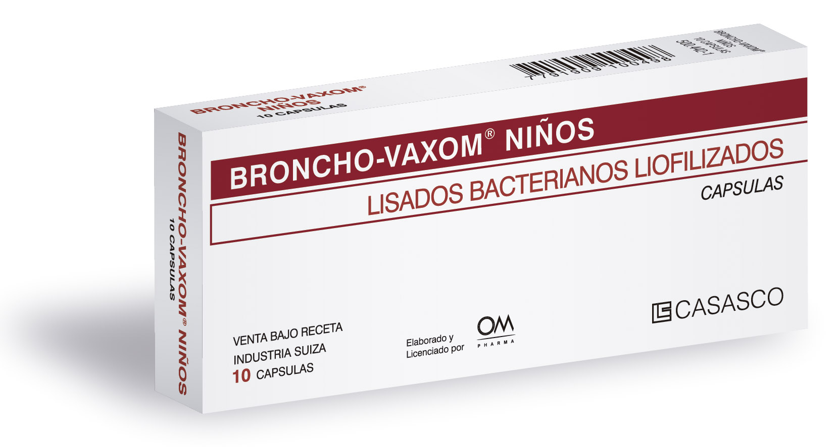Image removed.       Image removed. Image removed.  Composición Broncho-Vaxom® Niños.  Cada cápsula contiene Lisados Bacterianos Liofilizados de: Haemophilus influenzae; Diplococcus pneumoniae; Klebsiella pneumoniae y ozaenae; Staphylococcus aureus; Streptococcus pyogenes y viridans; Neisseria catarrha 3,5 mg. Excipientes c.s. Broncho-Vaxom® Adultos. Cada cápsula de contiene Lisados Bacterianos Liofilizados de Haemophilus influenzae; Diplococcus pneumoniae; Klebsiella pneumoniae y ozaenae; Staphylococcus aureus; Streptococcus pyogenes y viridans; Neisseria catarrhalis 7 mg. Excipientes c.s.  Acción Terapéutica Agente inmunoestimulante.  Indicaciones Inmunoterapia. Prevención de infecciones recurrentes de las vías respiratorias y exacerbaciones infecciosas agudas de la bronquitis crónica. Tratamiento adyuvante de las infecciones agudas de las vías respiratorias.  Posología -Tratamiento preventivo y/o terapéutica de consolidación: 1 cápsula diaria administrada en ayunas durante 10 días consecutivos al mes durante un lapso total de 3 meses. -Tratamiento de los episodios agudos: 1 cápsula diaria administrada en ayunas hasta la desaparición de los síntomas (como mínimo 10 días). Cuando el tratamiento requiera la administración simultánea de antibióticos, se recomienda la combinación con Broncho-Vaxom® desde el comienzo de la terapéutica. Niños de 6 meses a 12 años: el mismo modo de empleo que para los adultos, ya que Broncho-Vaxom® Niños representa la mitad de la dosis de Broncho-Vaxom® Adultos. Nota: las cápsulas de Broncho-Vaxom® Niños pueden abrirse y puede volcarse su contenido en una bebida (jugo de fruta, leche, etc.) en casos en los cuales el niño tenga dificultad para tragarla. Contraindicaciones Hipersensibilidad conocida a los componentes del BRONCHO-VAXOM.  Presentaciones Envases con 10 y 30 cápsulas.