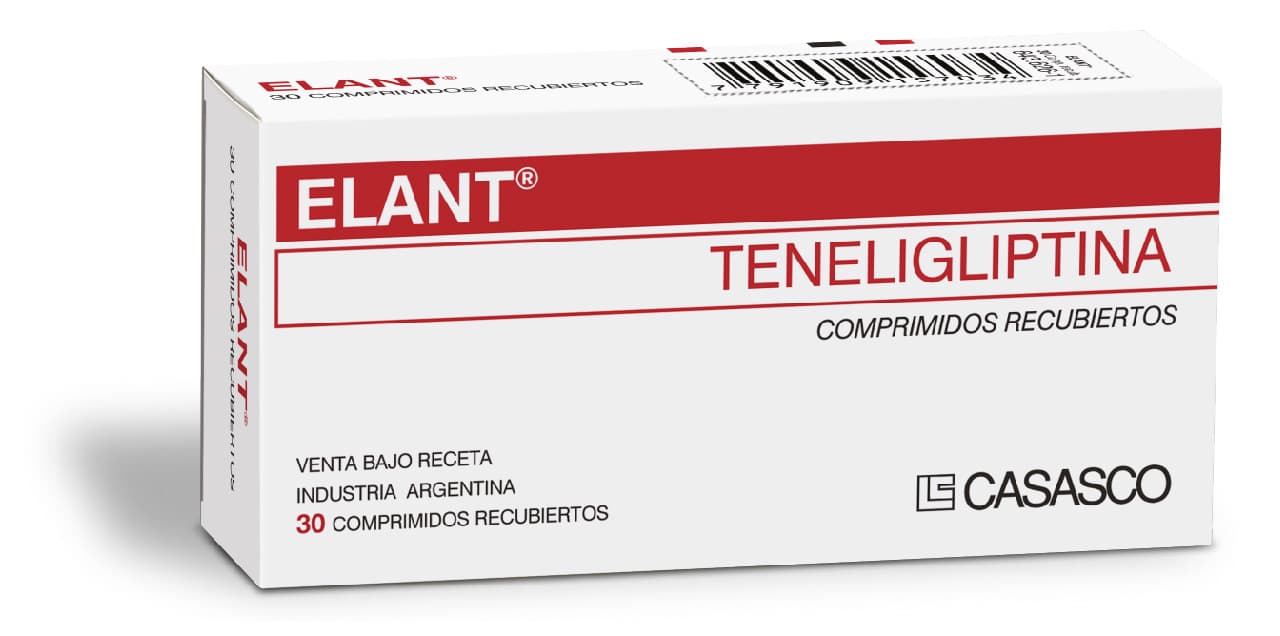 Image removed.     Image removed.   Fórmula Cada comprimido recubierto contiene: teneligliptina (como teneligliptina bromhidrato) 20,00 mg. Excipientes c.s.  Acción Terapéutica Hipoglucemiante oral, inhibidor de la dipeptidil peptidasa 4 (DPP-4).  Indicaciones ELANT está indicado para mejorar el control de la glucemia en los pacientes adultos con diabetes tipo 2, sin respuesta adecuada al tratamiento con dieta y ejercicio, ni al agregado de biguanidas, sulfonilureas, ni tiazolidinedionas.  Posología y Modo de Administración Adultos: un comprimido (20 mg) una vez al día. En casos de efecto insuficiente, se puede aumentar la dosis a dos comprimidos (40 mg) una vez al día. ELANT puede administrarse en cualquier momento del día, con alimentos o lejos de ellos.  Contraindicaciones Pacientes con antecedentes de hipersensibilidad a cualquiera de los componentes del medicamento. Pacientes con diabetes tipo 1. Cetoacidosis. Pre coma o coma diabético. Infecciones graves. Pre y post quirúrgico. Traumatismos graves. Lactancia.  Presentación Envases con 30 comprimidos recubiertos.